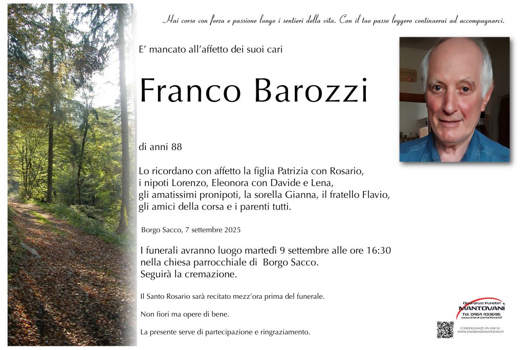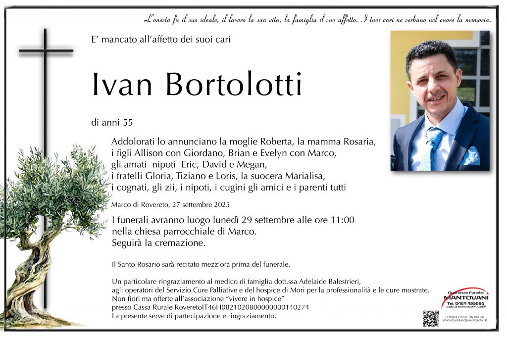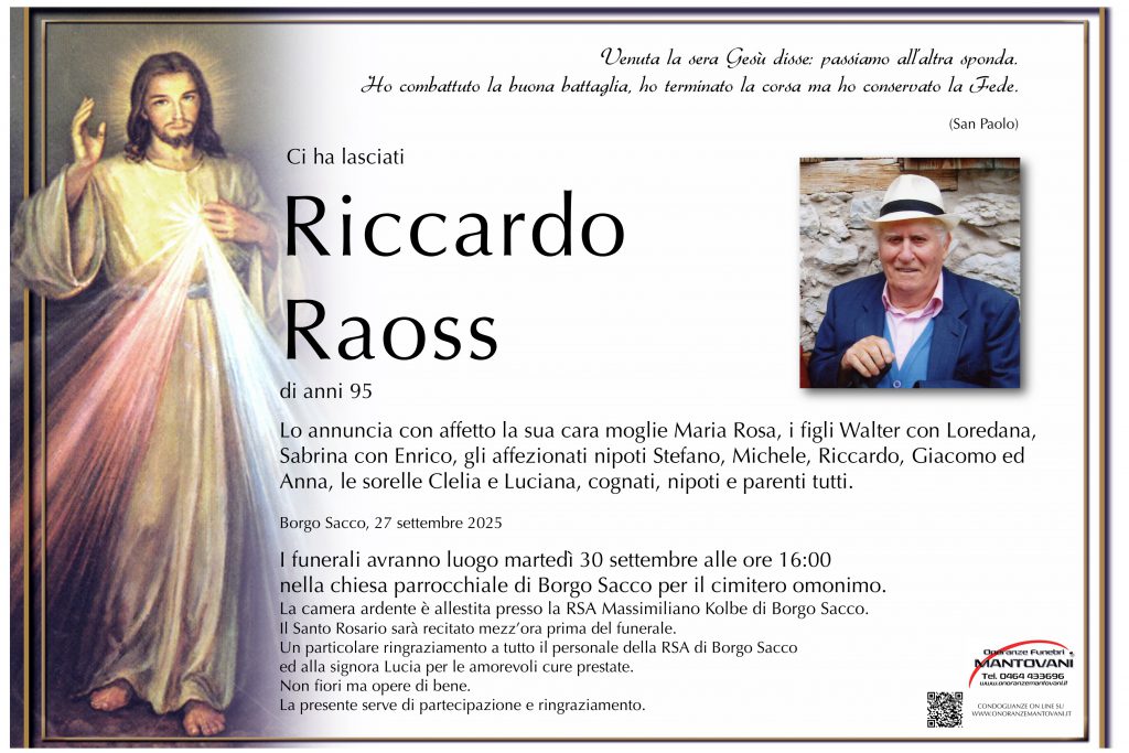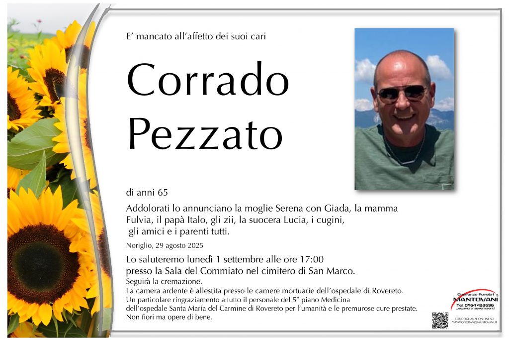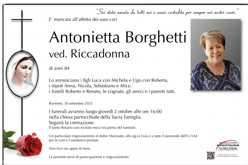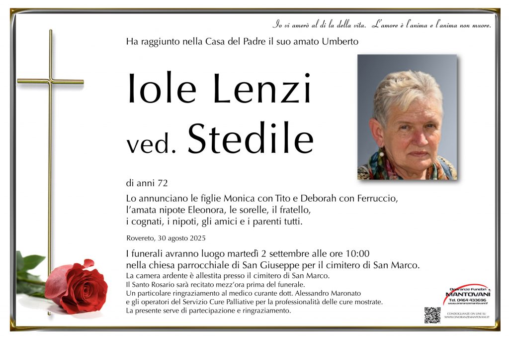 I funerali avranno luogo martedì 2 settembre alle ore 10:00 nella chiesa parrocchiale di San Giuseppe.