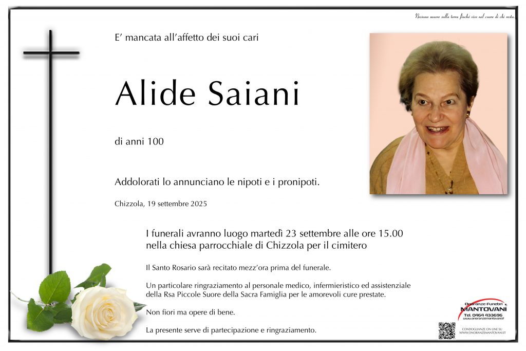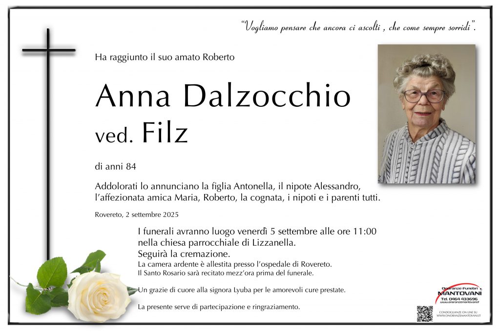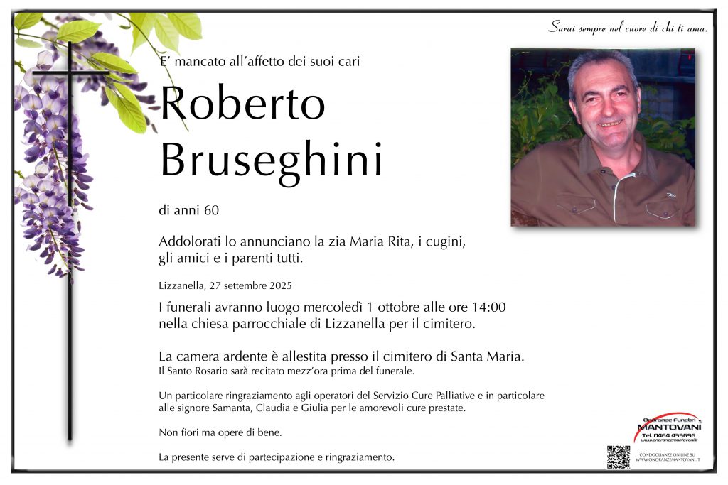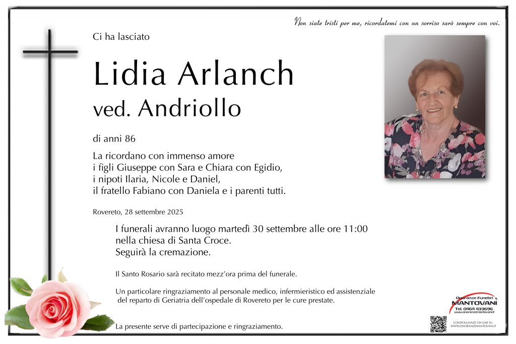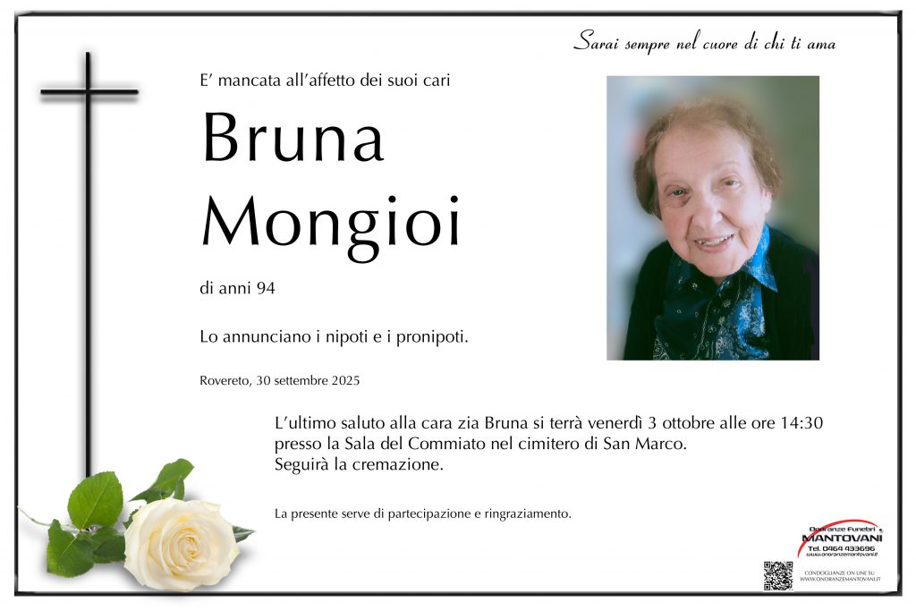 L’ultimo saluto alla cara zia Bruna si terrà venerdì 3 ottobre alle ore 14:30 presso la Sala del Commiato nel cimitero di San Marco.